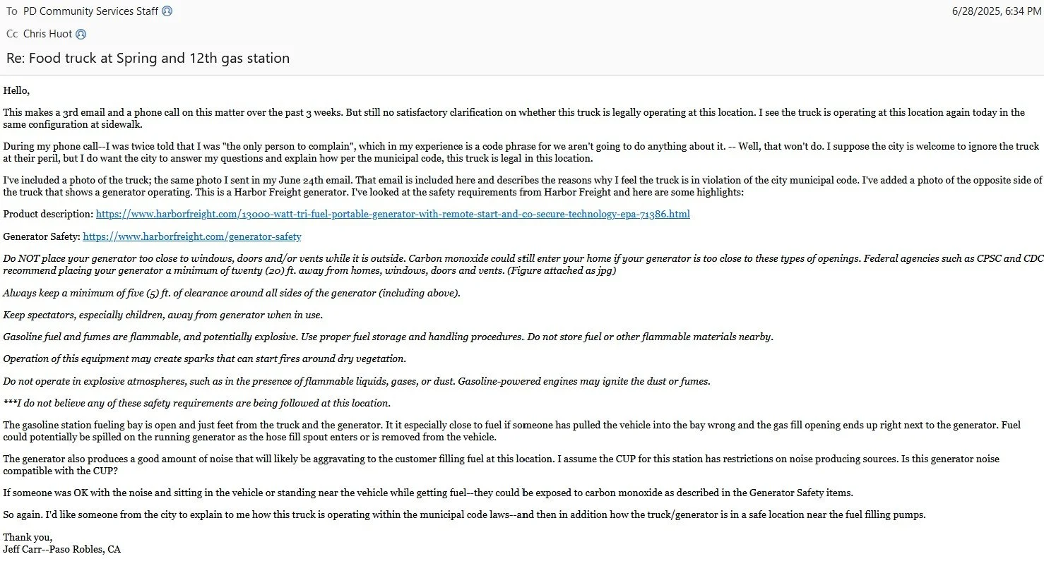 June 30, 2025: Final Email Sent to Code Enforcement re: Food Truck